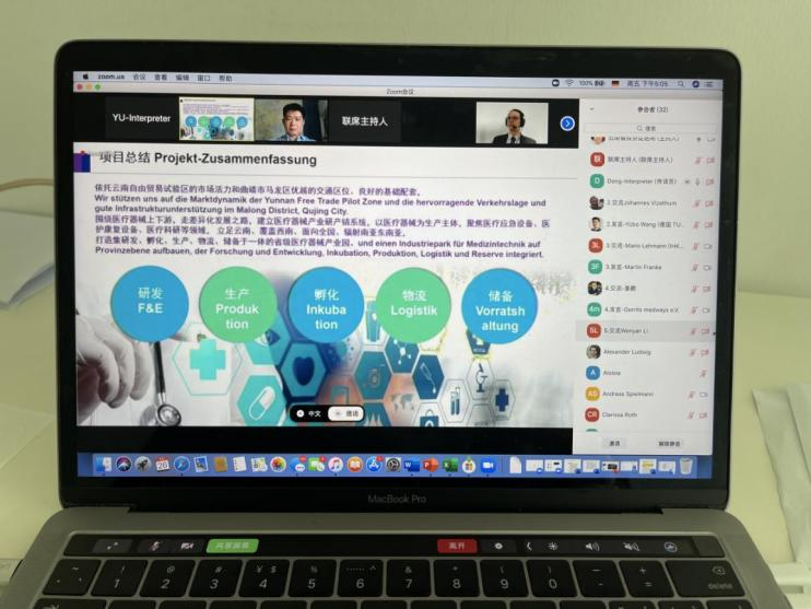 此次推介会以中德重点产业推荐为主题,云南省昆明市、曲靖市、红河州的招商部门以及德国客商以线上连线的方式参会。推荐会分别对昆明高新区重点项目、滇中新区汽车及高端装备制造产业、云南曲靖医疗器械产业、红河哈尼族彝族自治州的医疗、农业、电子设备等项目作出了详细介绍。